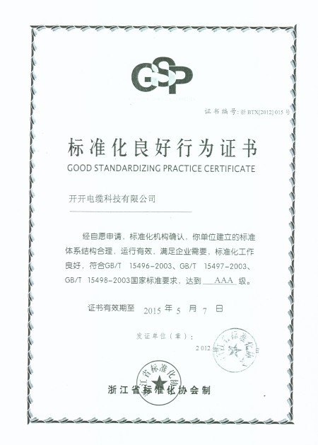 2012年5月7日,經(jīng)浙江省標準化協(xié)會(huì )評定,我司的標準化體系被評為AAA級并被授予標準化良好行為證書(shū)。