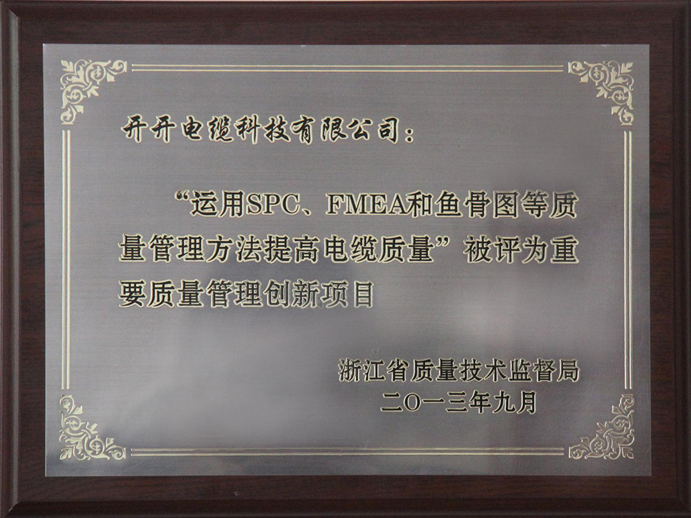 致力于為社會(huì )提供安全、節能、環(huán)保的電線(xiàn)電纜產(chǎn)品和服務(wù)2013年9月13日,浙江省質(zhì)量技術(shù)監督局組織全省規模以上企業(yè)在臨安青山湖杭氧集團召開(kāi)了2013年度省質(zhì)量管理創(chuàng )新項目發(fā)布會(huì ),會(huì )上發(fā)布了“2013年質(zhì)量管理創(chuàng )新項目成果”。全省共有38家企業(yè)獲獎,其中,重大質(zhì)量管理創(chuàng )新項目(一等獎)2項、重要質(zhì)量管理創(chuàng )新項目(二等獎)9項、應用型質(zhì)量管理項目(三等獎)27項。開(kāi)開(kāi)電纜科技有限公司的“運用SPC、FMEA和魚(yú)骨圖等先進(jìn)質(zhì)量管理方法提高電纜產(chǎn)品質(zhì)量”項目榮獲二等獎。